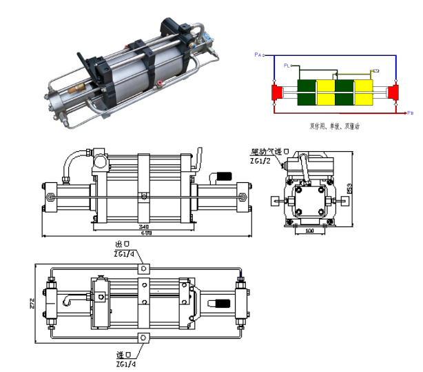 DTF-D系列是双驱动头,单极双作用泵,泵体采用优质铝合金和不锈钢缸体活塞,全部密封件均为进口优质产品,采用单气控平衡气体分配阀来实现泵的往复运动,最大设计驱动气压为10bar,适用于对气体、空气和工业气体,例如氮气、氩气、氢气和氦气等进行压缩,能够用于防爆场所,满足各种应用领域的要求。 DTD系列泵的驱动活塞直径为160mm,适用大流量工况下使用,泵头均带有排气冷却。 型号 增压比 最小气体 入口压力PA(bar) 最大气体 入口压力PA(bar) 最大允许 出口压力PB(bar) 气体出口 压力计算公式PB 气体进出口尺寸 最大流量L/min @PL=6bar DTF-D12 12:1 7 bar 32 bar 32 bar 12 PL+ PA ZG1/2 555@PA =6 DTF-D20 20:1 10 bar 160 bar 160 bar 20 PL+ PA ZG1/4 378@PA =8 DTF-D32 32:1 15 bar 256 bar 256 bar 32 PL+ PA ZG1/4 282@PA =8 DTF-D50 50:1 20 bar 400 bar 400 bar 50 PL+ PA ZG1/4 198@PA =8 DTF-D80 80:1 35 bar 640 bar 640 bar 80 PL+ PA ZG1/4 146@PA =8 DTF-D128 128:1 45 bar 1024bar 1024bar 128 PL+ PA ZG1/4 131@PA =8 DTF-D158 158:1 45 bar 1264bar 1264bar 158 PL+ PA ZG1/4 68@PA =8 DTF-D200 200:1 75 bar 1600bar 1600bar 200 PL+ PA ZG1/4 47@PA =8